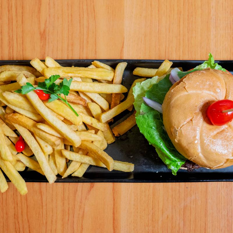 1/2 Pound prime beef patty, romaine, tomato, red onion, cheddar cheese on a burger bun served with fries.